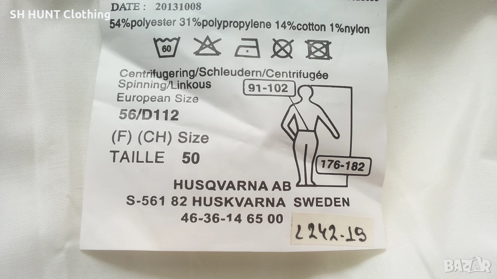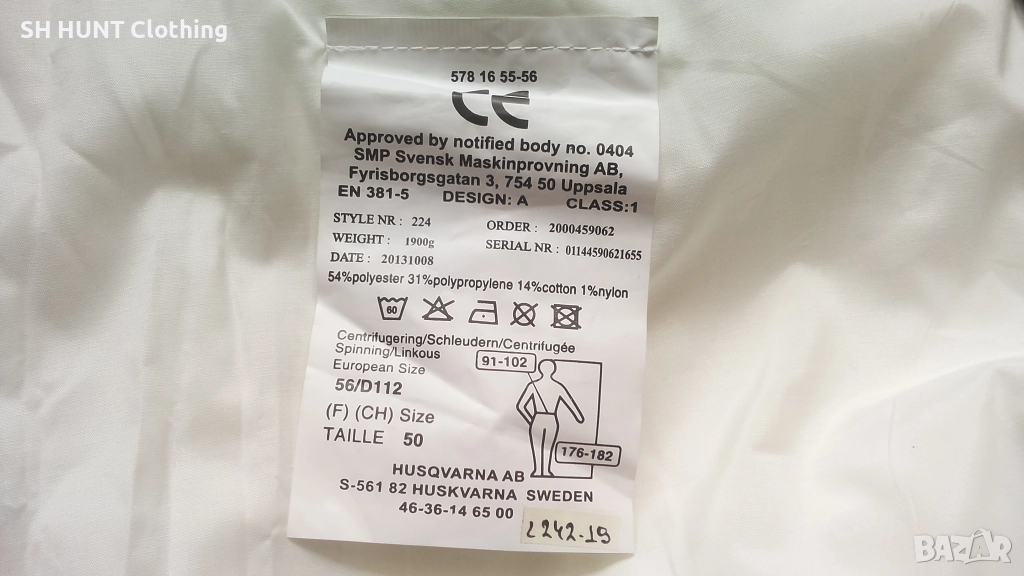 Марка: Husqvarna Overalls - полугащеризон със защита против срязване L242-19 Размер: 56 / XXL - ширина в талията при опънат ластик 58 см , ширина в талията при свит ластик 50 см , дължина 117 см до колана.