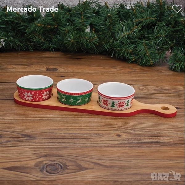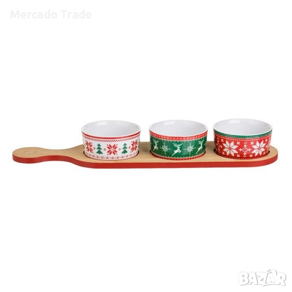 Коледен комплект с бамбукова основа 38.5x10 см с места за 3 кръгли керамични купички за Ø8.5x4 см с коледни дизайни.