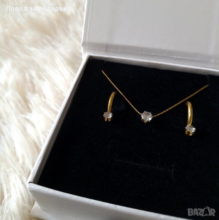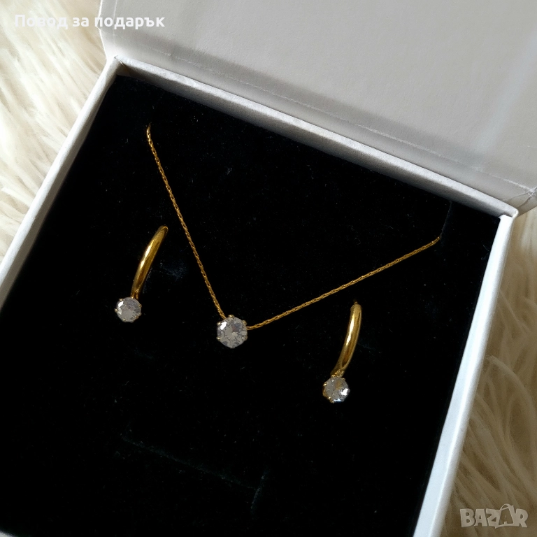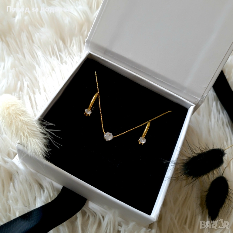 ✨️Финес и блясък, събрани в съвършен комплект, включващ нежно колие и обеци от неръждаема стомана със златно покритие, украсени с изискан цирконов камък, който придава деликатен, но запомнящ се блясък - идеален баланс между класика и модерност. ✨️