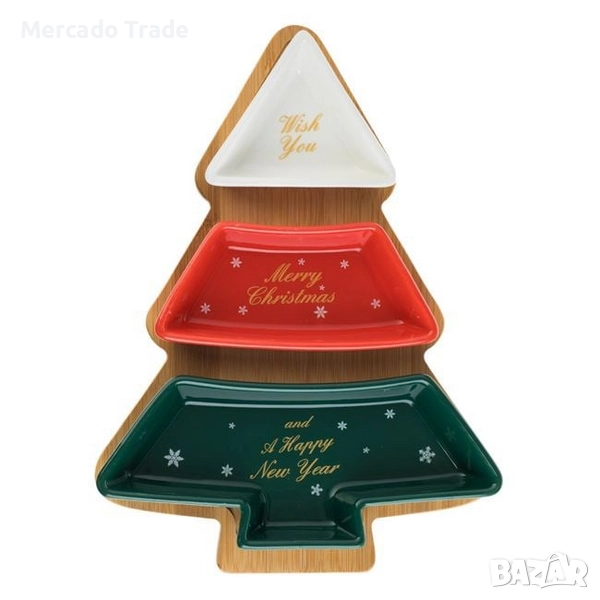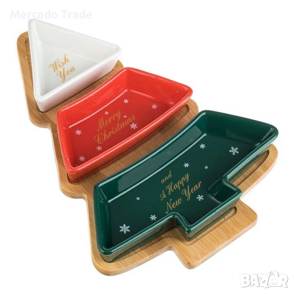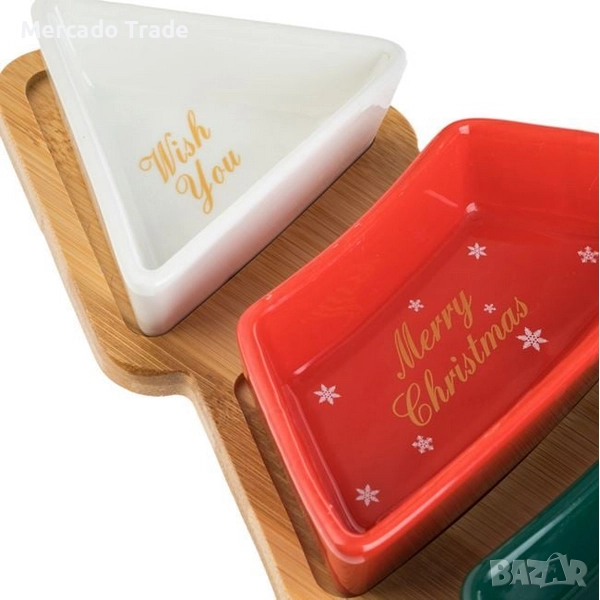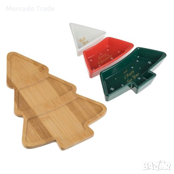 Коледен комплект с основа във формата на бамбукова елха 27.5x20 см с места за 3 керамични купички (9x8.5 см, 14.5x6.8 см & и 20.1x8,6 см) с коледни дизайни.