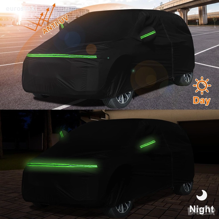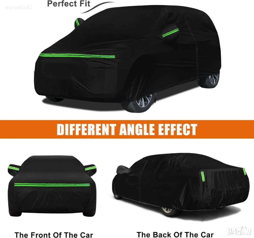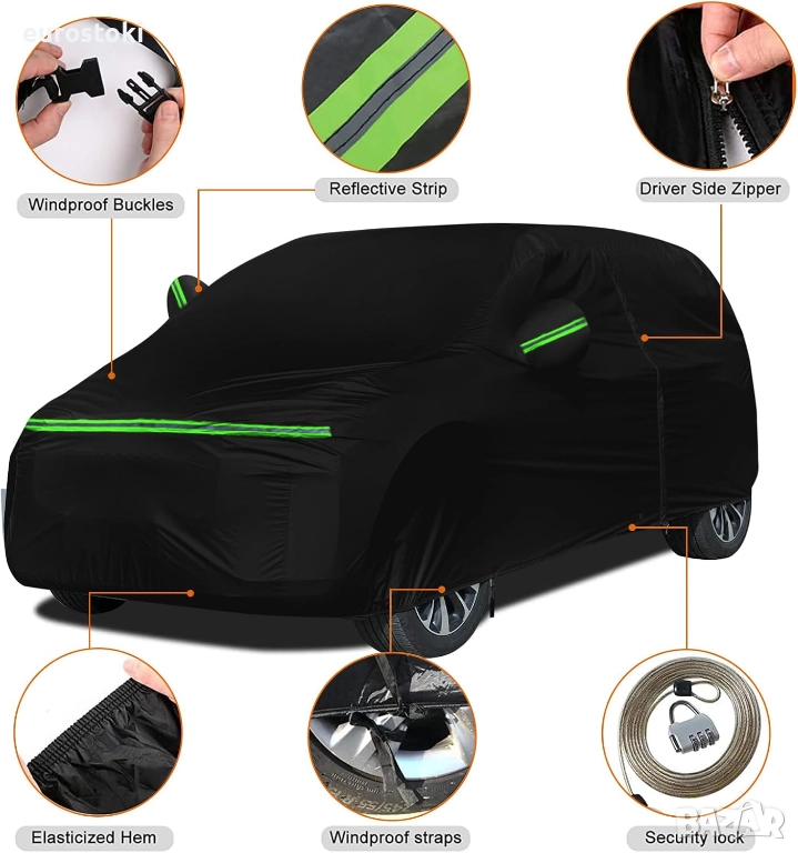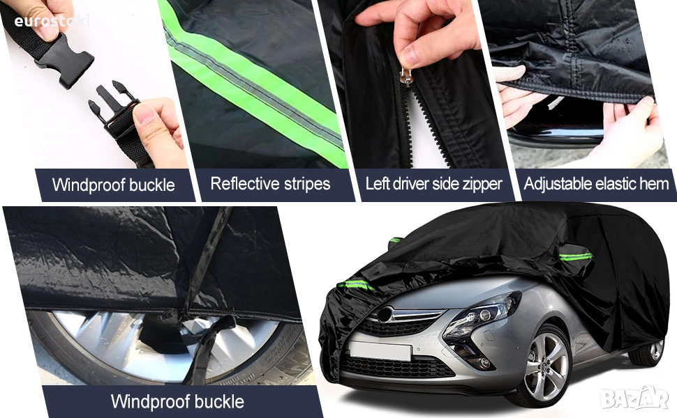 ДЕТАЙЛИ НА ДИЗАЙНА 1: С цип на вратата от лявата страна за лесен достъп. 2. Ветроустойчиви ленти отпред и отзад за фиксиране на покривалото за кола при силен вятър. 3. Светлоотразителни ленти, които да напомнят на хората през нощта. 4. Красивите джобове за огледала предпазват огледалото ви от повреда. 5: Регулируемите еластични подгъви в долната част ви позволяват лесно да регулирате размера. 6: Четири ленти за закрепване ви помагат да фиксирате покривалото на четири колела.