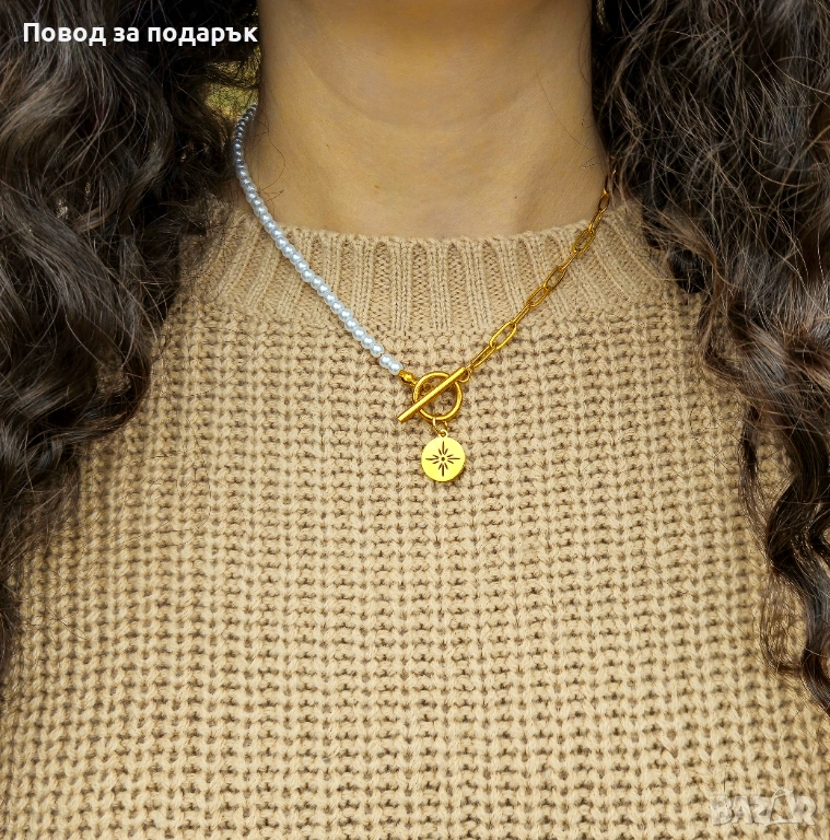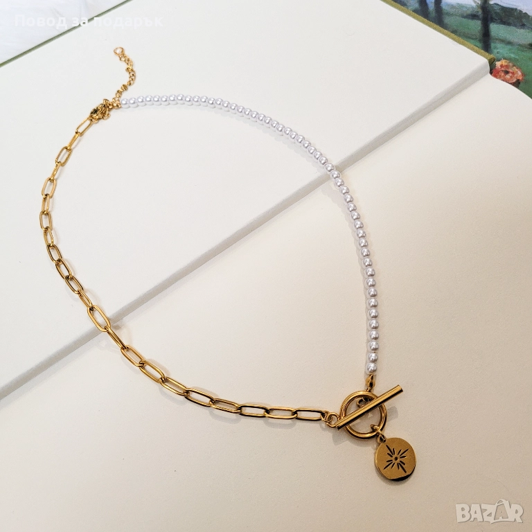 Изработено от неръждаема стомана със златисто покритие, то впечатлява с уникалния си асиметричен дизайн – едната половина от изящни перли, а другата от модерна златиста верижка.