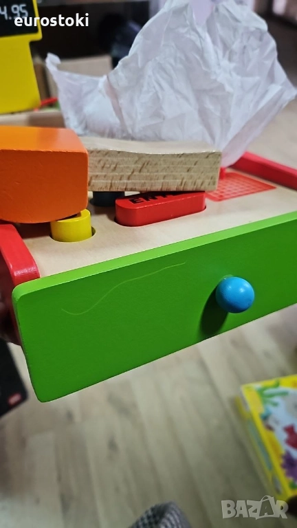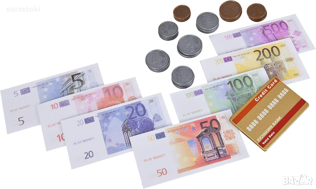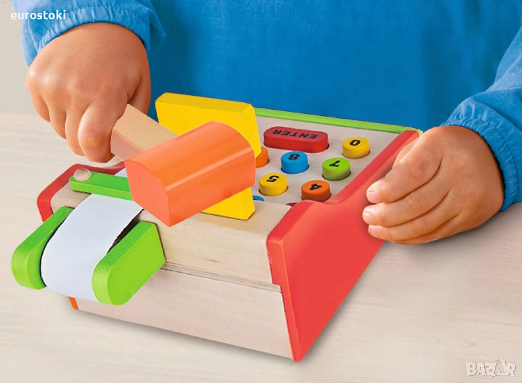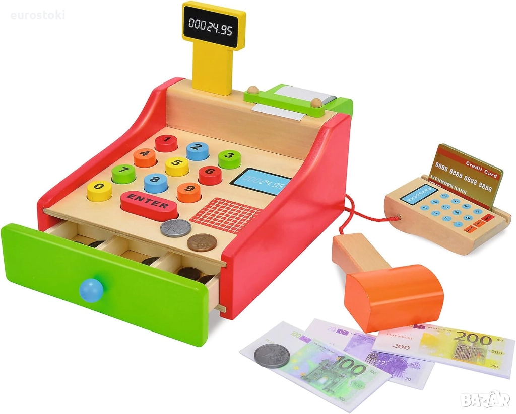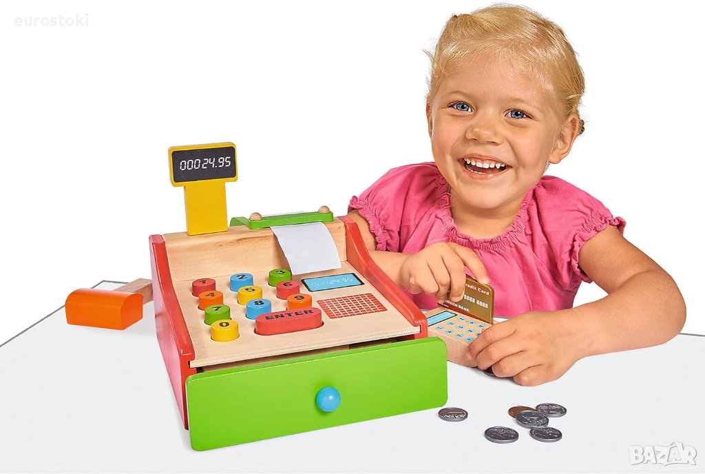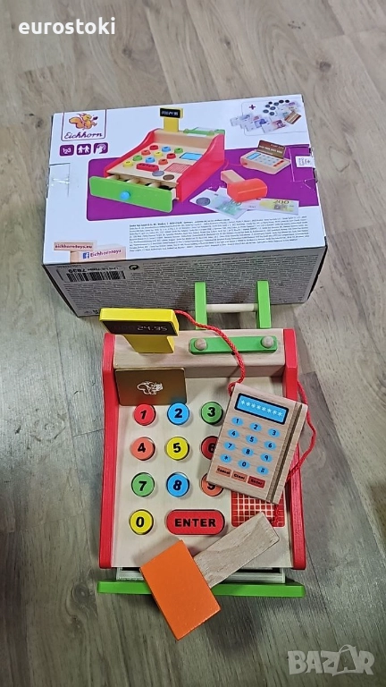Касовият апарат Eichhorn не бива да липсва в нито един магазин за хранителни стоки. Всички закупени артикули се сканират със скенера или се изчисляват чрез цветните бутони. Плаща се с EC карта и четец на EC карти. В чекмеджето ще намерите и съответстващи ресто. Комплектът включва касов апарат, ролка хартия за касови бележки, скенер, четец на карти, включително карта и ресто. Касовият апарат е с размери 16,5 x 26 x 16 см и е подходящ за деца над 3 години.