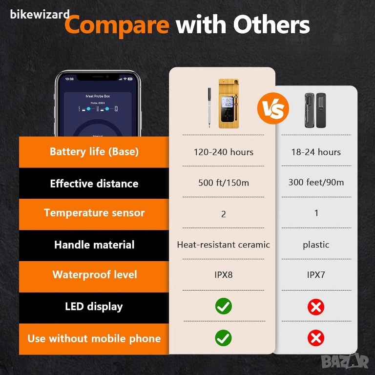 Измерва температури от -20°C до 100°C (-4°F до 212°F) за перфектни резултати при готвене. BLUETOOTH ОБХВАТ ОТ 152 МЕТА: Насладете се на истинска безжична свобода с Bluetooth обхват от 152 метра. Лесно следете грила или фурната си, дори когато сте далеч от кухнята. РАБОТА БЕЗ ПРИЛОЖЕНИЕ: Използвайте без смартфон! Основата разполага с вграден LCD екран и бутони за управление, така че можете да задавате целеви температури и да следите вътрешните и околните температури в реално време. ЛЕСНО ЗА ИЗПОЛЗВАНЕ ПРИЛОЖЕНИЕ: Предварително заредено с повече от дузина температури на месо (препоръчвано от USDA), ясни указания и лесно управление, което улеснява начинаещите да готвят вкусно. Поддържа наблюдение на множество устройства едновременно за по-бързо и по-ефективно готвене. БЪРЗО ЗАРЕЖДАНЕ, ДЪЛГО ВРЕМЕ НА РАБОТА: Бързото зареждане с USB-C осигурява до 240 часа работа на базата и 24 часа непрекъсната употреба на сондата, идеално за дълги готвене или барбекюта през уикенда. ТЕРМОУСТОЙЧИВА КЕРАМИЧНА ДРЪЖКА: Специално проектираната керамична дръжка може да издържи до 300°C, което я прави идеална за печене на скара, опушване, печене във фурна и други. Подходяща за говеждо, пилешко, свинско, агнешко и риба. ВОДОУСТОЙЧИВА И ЛЕСНА ЗА ПОЧИСТВАНЕ IPX8: Керамичната дръжка и сондата от неръждаема стомана са водоустойчиви по IPX8, лесни за избърсване или изплакване. (Забележка: Оставете сондата да се охлади преди измиване, за да избегнете термичен шок и да защитите сензора.)