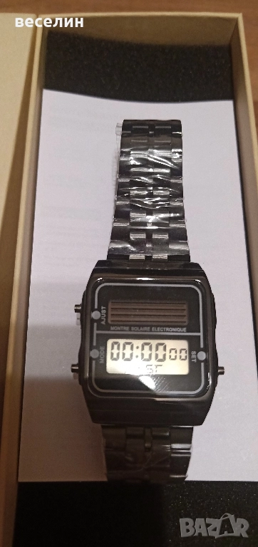 Чисто нов часовник, подобен на CASIO с кутия,документи и инструмент за регулиране на каишкатa. Метална, регулируема каишка и метален безел. Соларно зареждане. Функции хронометър, аларма, звук на кръгъл час. Тегло: 57.5 гр, дебелина 8.7 мм, каса 38 мм, водоустойчив до 3 АТ.
