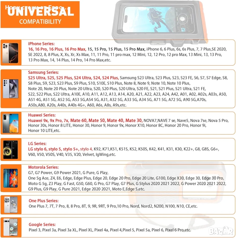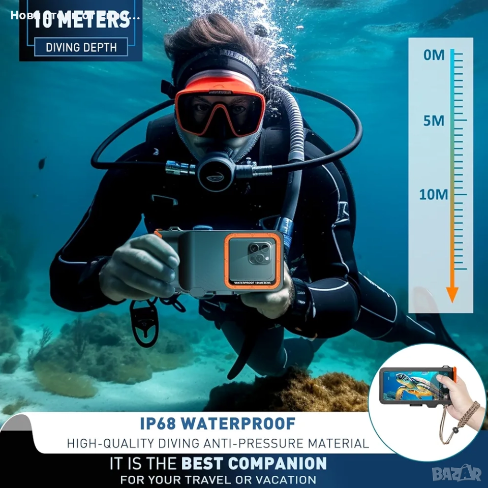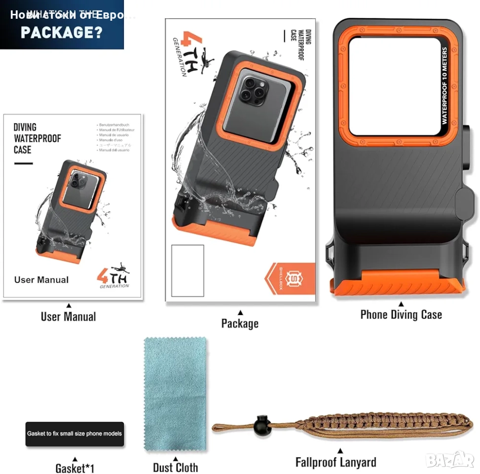 Водоустойчив калъф за телефон, за гмуркане на открито, шнорхелинг, плуване, сърф, подводен калъф с тъчскрийн за iPhone 16 Pro Max, Samsung S25 Ultra, не повече от 6.9 инча, черен/оранжев, Ето го и водоустойчивият калъф за мобилен телефон Saupsitnz 2025 - перфектното решение за всички ваши подводни снимки. Нашият универсален калъф за гмуркане е перфектният аксесоар за авантюристи, които обичат да сърфират, да шнорхелират, да се гмуркат или плуват със своя смартфон. В сравнение с други подводни калъфи за телефони за гмуркане с шнорхел на пазара, нашият водоустойчив калъф за телефон ви позволява да използвате сензорния си екран под вода, без да са необходими допълнителни приложения или Bluetooth контроли. Той е съвместим и с най-новите професионални корпуси за гмуркане IP68 и може да побере повечето смартфони с размер на екрана до 6,9 инча, включително популярни марки като Apple, Samsung, Huawei, LG, Motorola, OnePlus и Google. Изработен от висококачествени водоустойчиви материали с IP68, устойчиви на натиск, нашият водоустойчив калъф за телефон може да бъде потопен до 10 м и осигурява ясни изображения и безпроблемен подводен контрол. Прецизните изрези, изработени от стъкло против отблясъци, осигуряват висококачествени изображения или видеоклипове. За да увеличим подводното изживяване, предлагаме три различни по дебелина задни подложки на поставката за мобилен телефон, които значително разширяват контактната повърхност между екрана на телефона и калъфа за гмуркане, правейки чувствителността на сензорния екран по-ефективна. Нашият подводен калъф за телефон е оборудван и с точка за закрепване към статив, така че може да се монтира на моноподи, стативи или стабилизатори и може лесно да се запечатва и разглобява за по-голям комфорт. Поръчайте нашия водоустойчив калъф за мобилен телефон още днес и никога повече не пропускайте подводните си моменти! Моля, прочетете внимателно приложените инструкции преди монтаж.