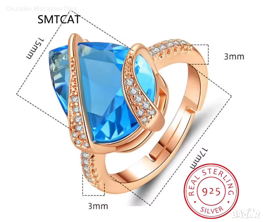 Основен камък: Син циркон, форма „водна капка“ (18×15 мм)