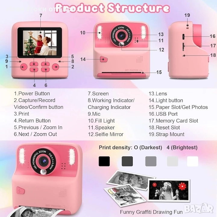 хартия за печат, което позволява на децата да рисуват върху снимки и да изразяват своята креативност. Освен това можете лесно да прехвърляте изображения и видеоклипове на вашия компютър с помощта на включения Type-C кабел. Правете снимки и записвайте непрекъснато в продължение на 2-3 часа. Бъдете креативни с тази преносима моментална камера
