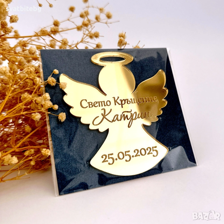 Елегантни златни книгоразделители за кръщене, персонализирани подаръчета с име, дата и символ по избор. Изработени от огледален златен акрил с фина гравюра и стилен пискюл, те са перфектният подарък за гости.