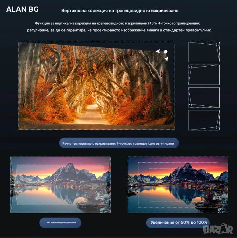 Корекция на трапецовидно изкривяване: ±45° корекция на трапецовидно изкривяване, поддържа четириточкова корекция на трапецовидно изкривяване