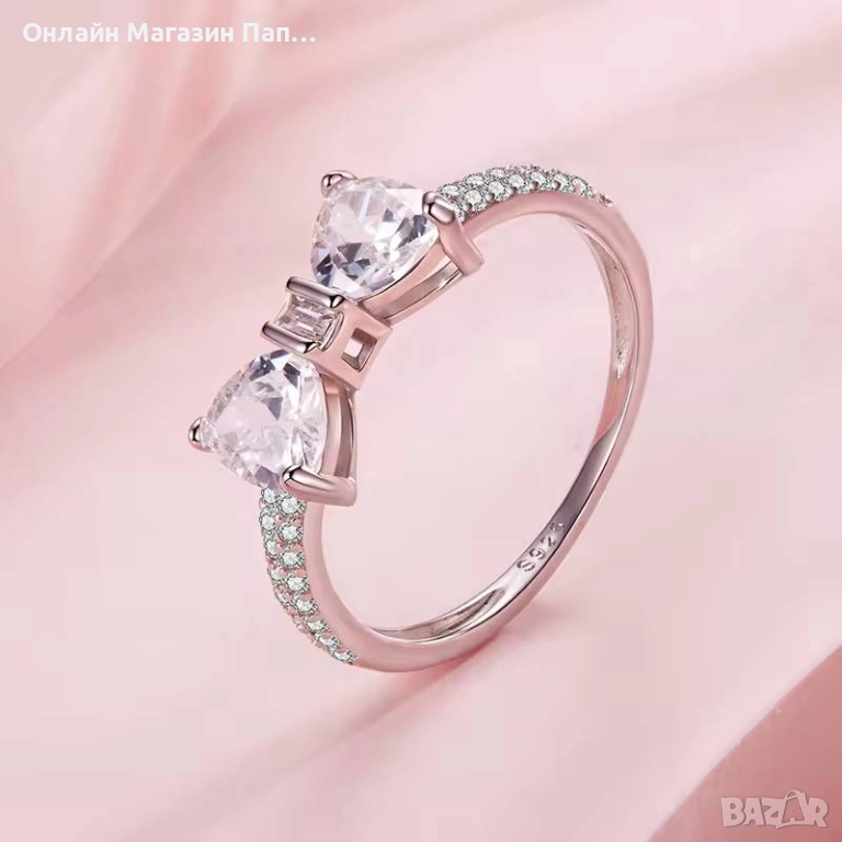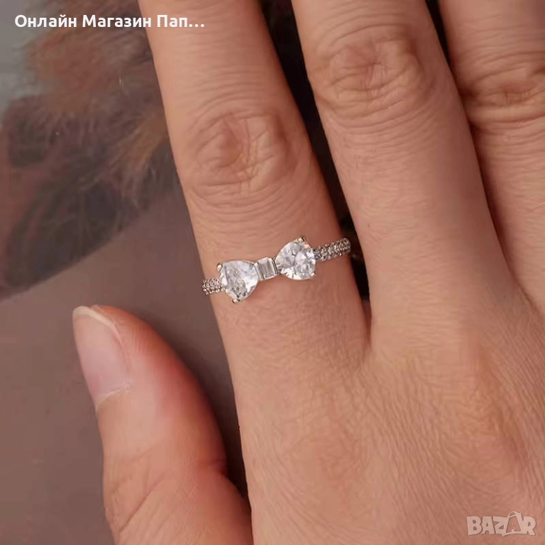 Централният прозрачен AAA циркон блести ярко, а халката е инкрустирана с малки паве циркони, които подчертават нежния дизайн. Формата на панделка придава романтичност и елегантност.