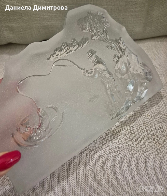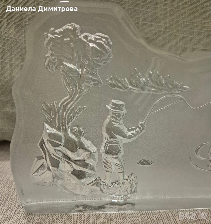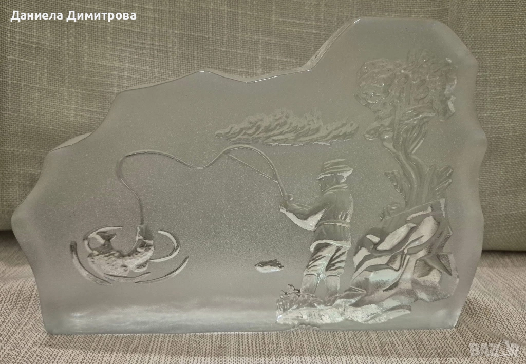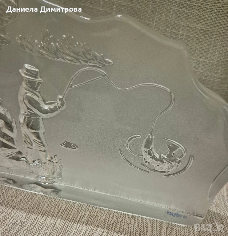 Ръчно изработено произведение на изкуството от прочута шведска стъкларска фабрика.Известна като "Рибарят" от Nybro Glasbruk. Тази изящна кристална скулптура улавя вечния момент на риболов с муха - майсторско съчетание на природа, концентрация и чиста стъклена красота. Изработена от плътно, ръчно формовано кристално стъкло, характерно за фабриката. Детайлно гравираната сцена изобразява рибар, дърво, облаци и реалистично изображение на рибар уловена на въдицата.
