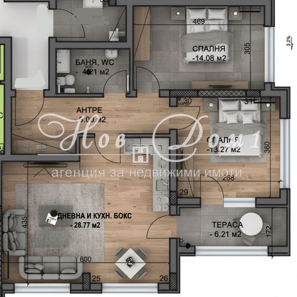 Просторна дневна с кухненски бокс 28.77 м² с излаз към тераса