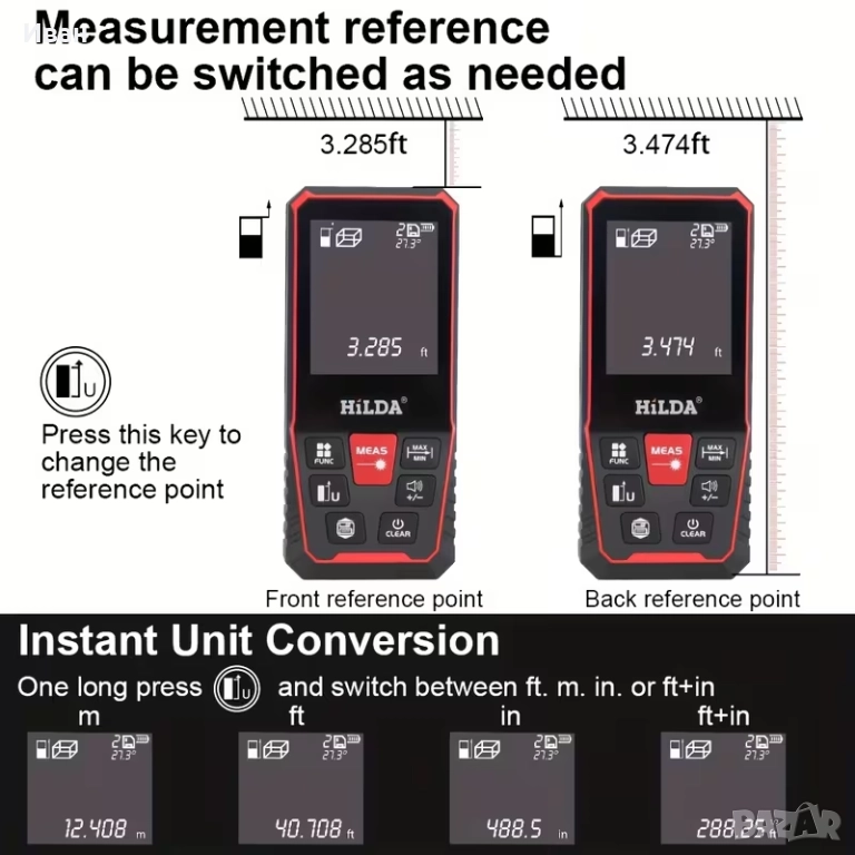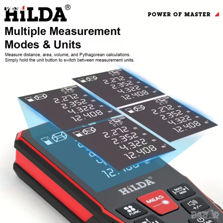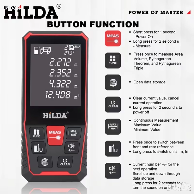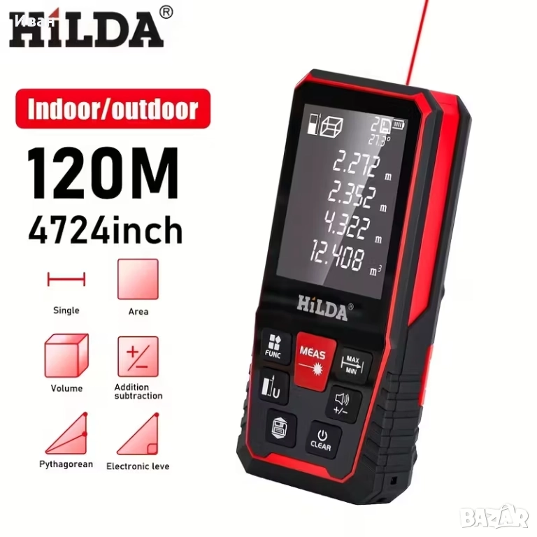 HILDA 120M преносим цифров лазерен далекомер с дисплей, инструмент за измерване на разстояние, ергономична дръжка, лек и здрав прибор, високо прецизен лазер.