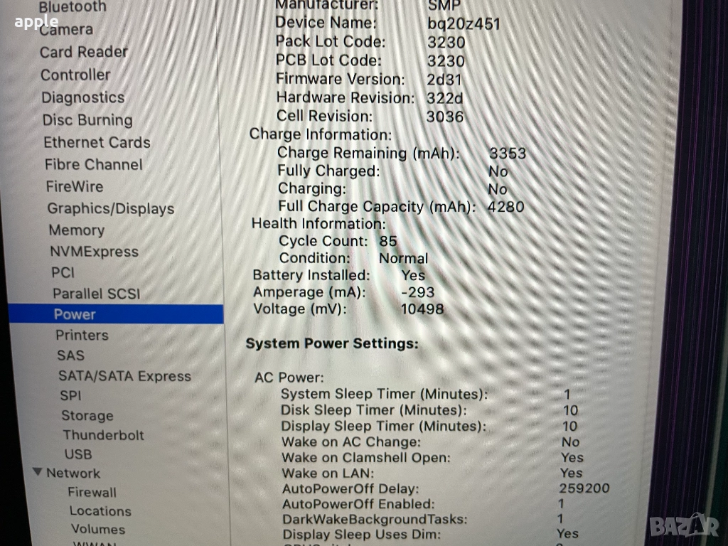 Лаптопът е в безупречно техническо състояние и запазен на вид,но с дефектен дисплей.Батерията държи до 4ч.Без зарядно у-во .Инсталиран Mac OS X.