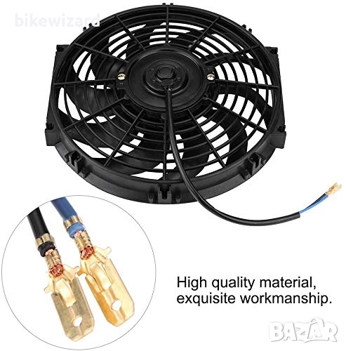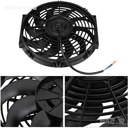 12-инчов вентилатор: 10 лопатки 12V 80W радиаторен вентилатор с монтажен комплект, изработен от висококачествена ABS пластмаса и стомана, лек, но с изключителна издръжливост.