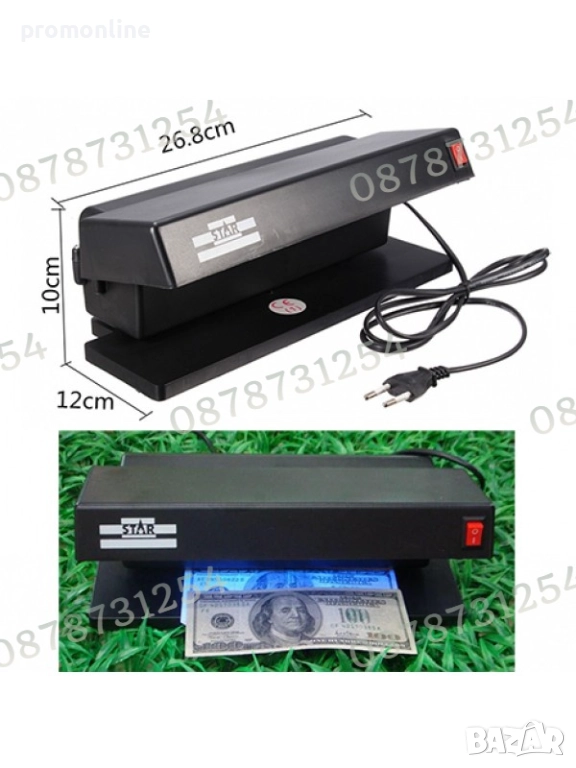 Детекторът за фалшиви банкноти е с две мощни UV лампи проверяват UV характеристиките в банкноти, лични карти, кредитни карти и всички други официални документи. Лампите монтирани в черният корпус са с достатъчна мощност при използване както през деня, така и през нощта.