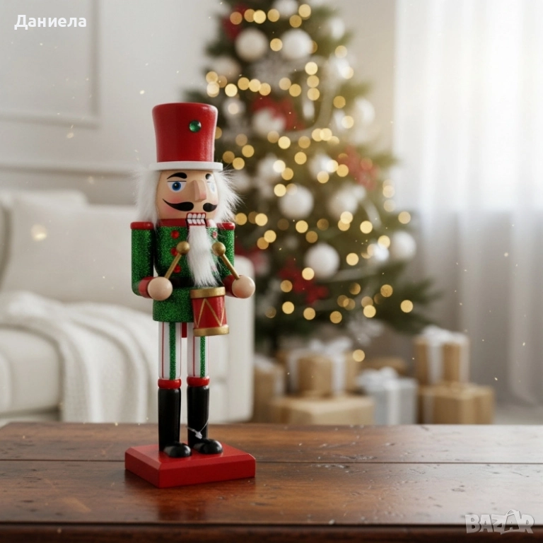 Материали: Дърво; различни варианти - изпраща се според наличността; Размери: Около 28 см височина; Цветове: Празнични – червено, бяло, зелено, златно; Безопасност: Гладка повърхност, стабилна основа; Допълнителни елементи: Декоративни аксесоари (меч, барабан, шапка – според модела); Подходящ за деца: Да, за декорация и лека игра; Опаковка: Цветна кутия — готова за подарък.