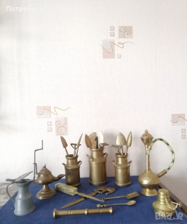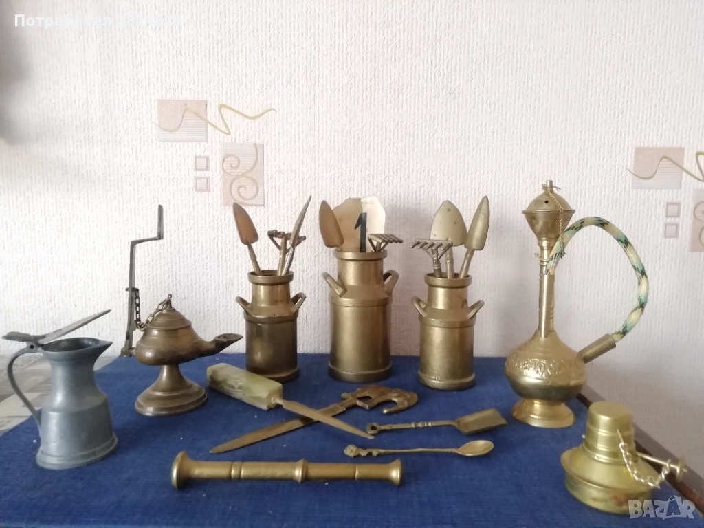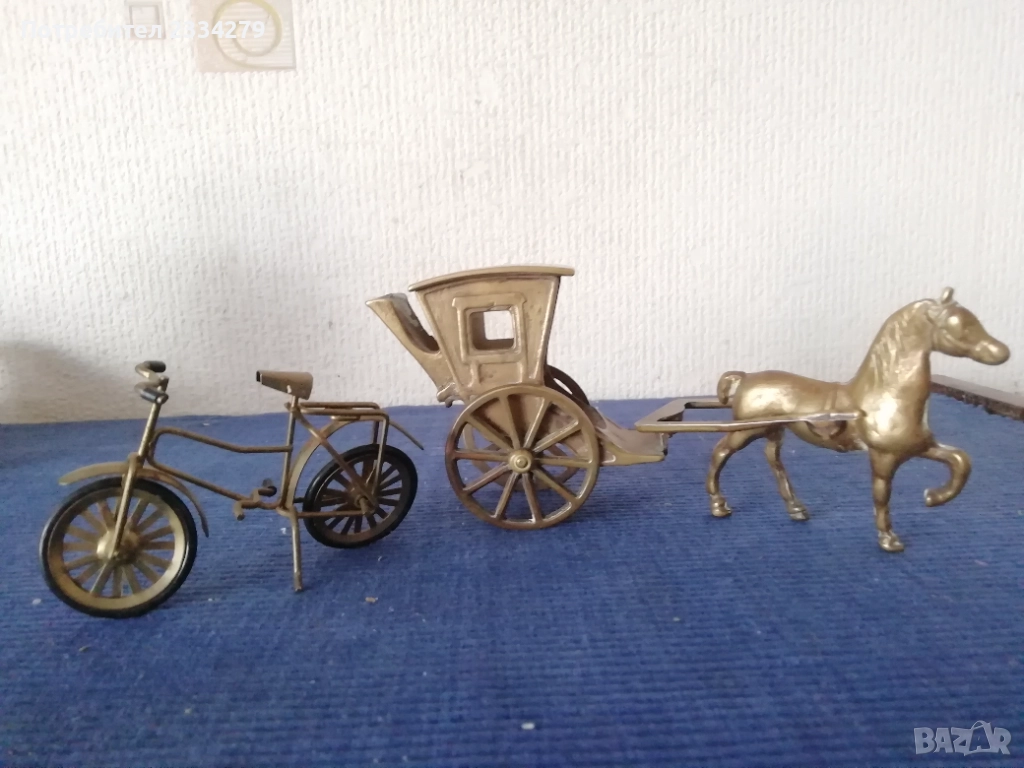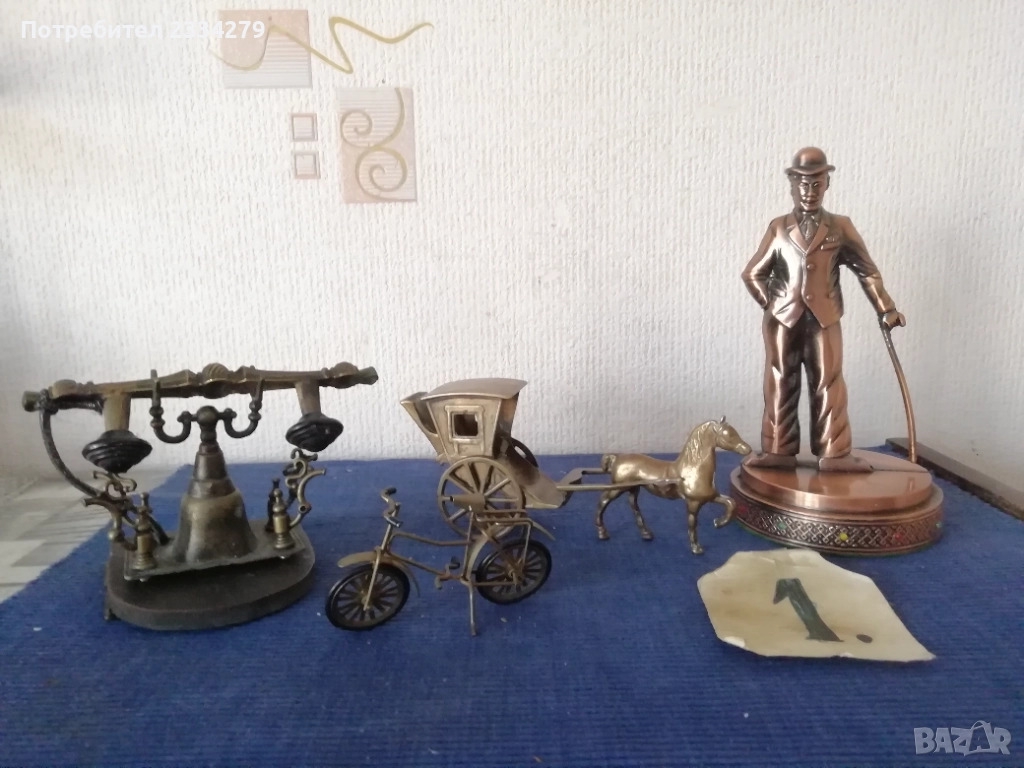 Стари бронзови фигурки статуетки ръчно и отливан изработки от различни автори, в различни държави и години. 1. (НЕВАЛИДНА!) ; 2. Фигура на ,,ПАУН" бронзова-месингова изработка с размери 25х23см., цена 15€.; 3. фигурка-статуетка ,,КАРЕТА С КОН" бронзова изработка с размери 18х8см., цена 15€.; 4.два комплекта мини свещници изобразяващи ,,АНГЕЛИ" единият е три ангела с размери 6х4см.,цена 3.50€ за бройка. Другият комплект от 7ангела и свещи в кутия, размер на ангел 5х4см., цена 13€.; 5. бронзови градински гюмове с инструменти, големият е с размери 13х8см.,тежи 700гр.,цена 15€., малките с размери 11х7см.,тежи 500гр.,цена 13€.; 6.бронзови-месингови фигурки, макети, статуетки: НЕРГИЛЕ с размери 20х9см.,цена 10€., АЛАДИНОВА ЛАМПА с размери 18х11см., цена 9€, ЛАМПА СПИРТНИК цена 5€.; 7. статуетка запалка ЧАРЛИ сувенир изработен в Еспания с размери 20х10см.,цена 8€.; 8. бронзови