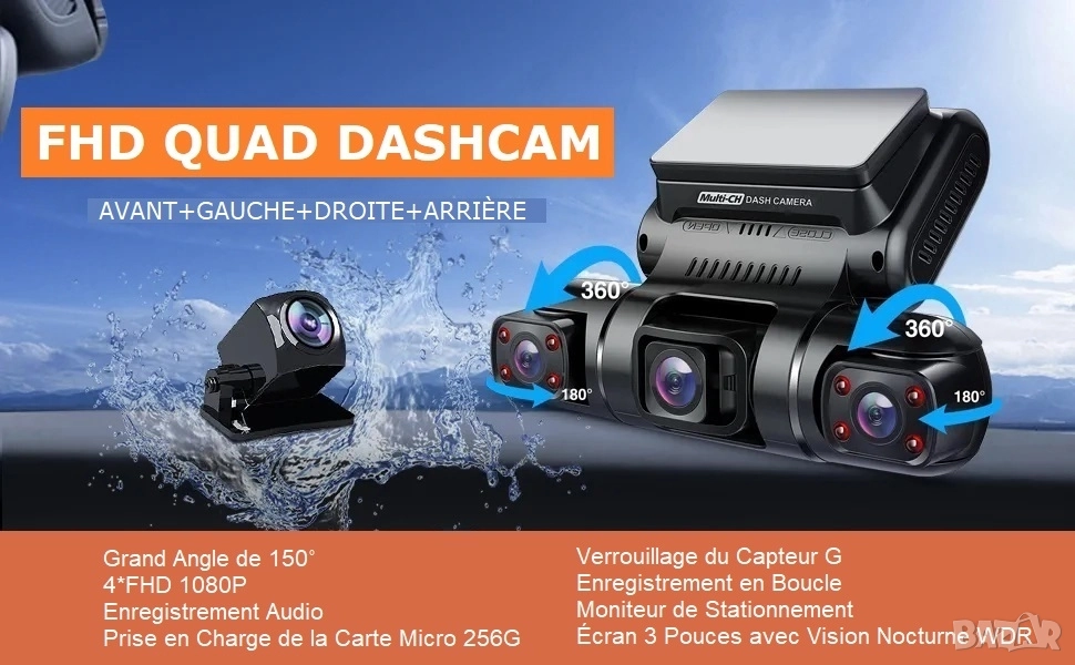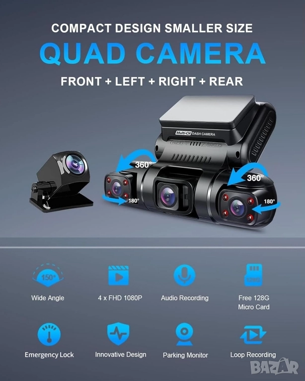 видеорегистратор е мощен и всестранен комплект от четири автомобилни камери, предназначен да запише всякакви събития около вашия автомобил от всички страни. С четири отделни обектива, които записват едновременно в 4K комбиниран изглед или в четири отделни 1080P видеоклипа, тази система ви предлага пълен поглед върху предната, лявата, дясната и задната страна на автомобила. Това я прави идеален спътник за ежедневно пътуване, паркиране и защита срещу измами при пътни инциденти.