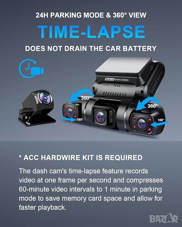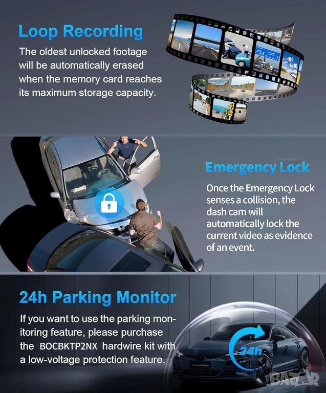 · 24-часово наблюдение при паркиране: Интелигентен режим, който се активира при засечено движение или удар, когато колата е изключена.