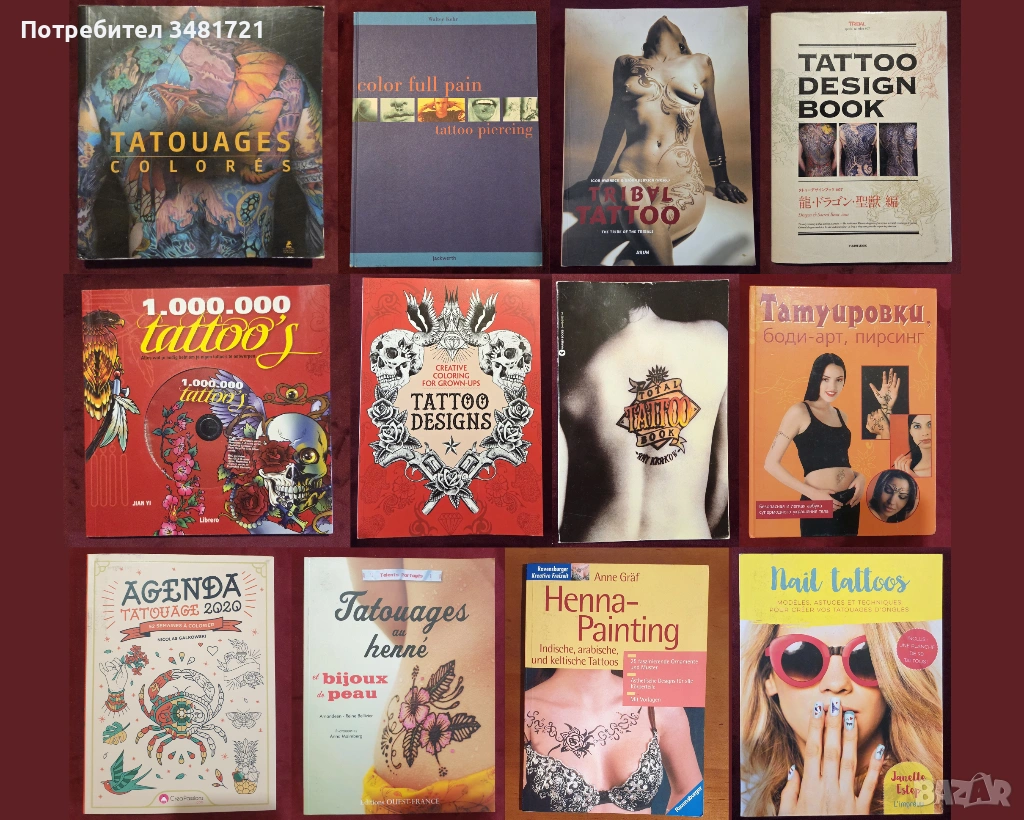 Визуален справочник, представящ контурно голям брой татуировки с опция за оцветяването им по усмотрение на читателя. Сред моделите са включени трайбъл и езически символи, елементи от поп културата, митични същества, сюрреалистични изображения и т.н.