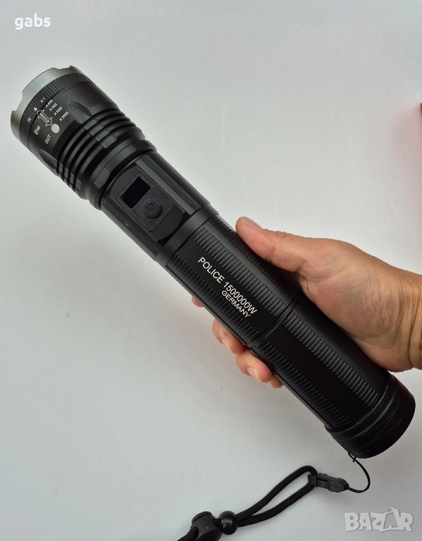 Мощен фенер POLICE с лазерен лъч и голям обхват до 2000 метра. Фенерът е с регулируема яркост и функция ZOOM. Захранва се с акумулаторна батерия, която се зарежда чрез USB кабел.