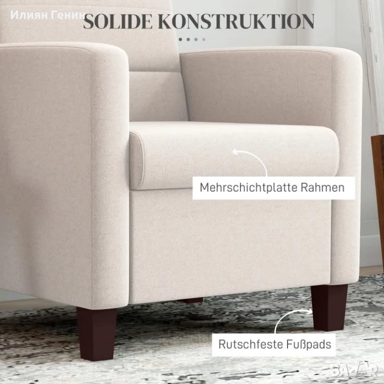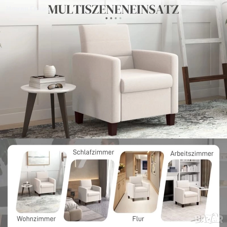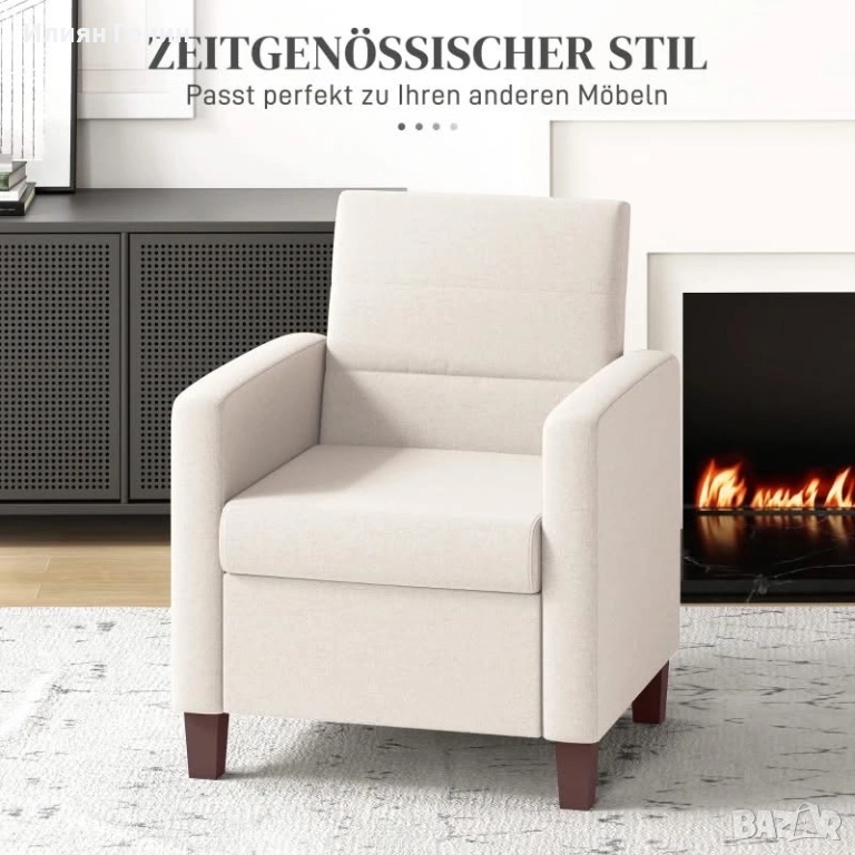 фотьойл HOMCOM с имитация на лен, пяна, възглавница за седалка, дървена рамка, кремаво бяло - 250.00лв.