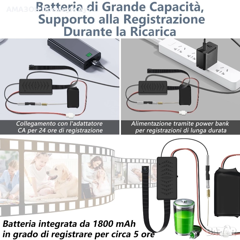 - Батерия с висок капацитет, множество опции за захранване. Мини шпионската камера е оборудвана с батерия от 1800mAh, която позволява 6 часа непрекъснат запис. Може да се свърже и към външна батерия или захранващ адаптер за непрекъснат запис.