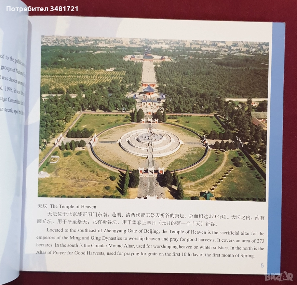 В текст, снимки и илюстрации, на английски и китайски език, е представена една от най-големите забележителности на Пекин - нейната история, съставни части и друга интересна информация.