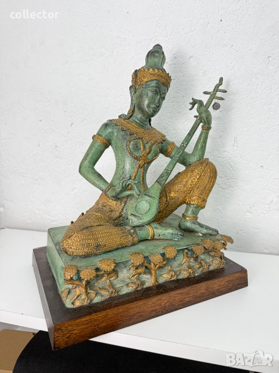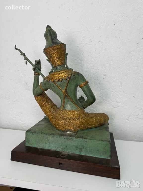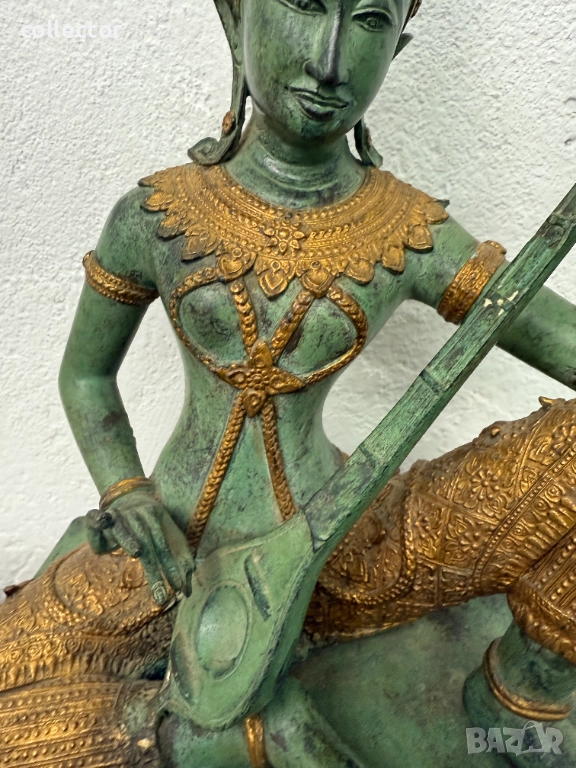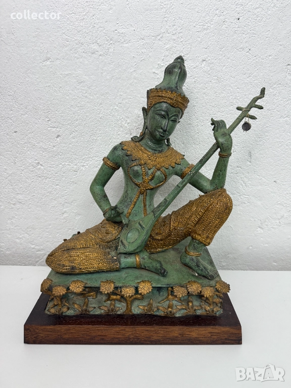 Перфектна бронзова скулптура в отличо състояние. Същата изобразява фигура на "БОЖЕСТВО" седнала в традиционна поза и свиреща на музикален инструмент.