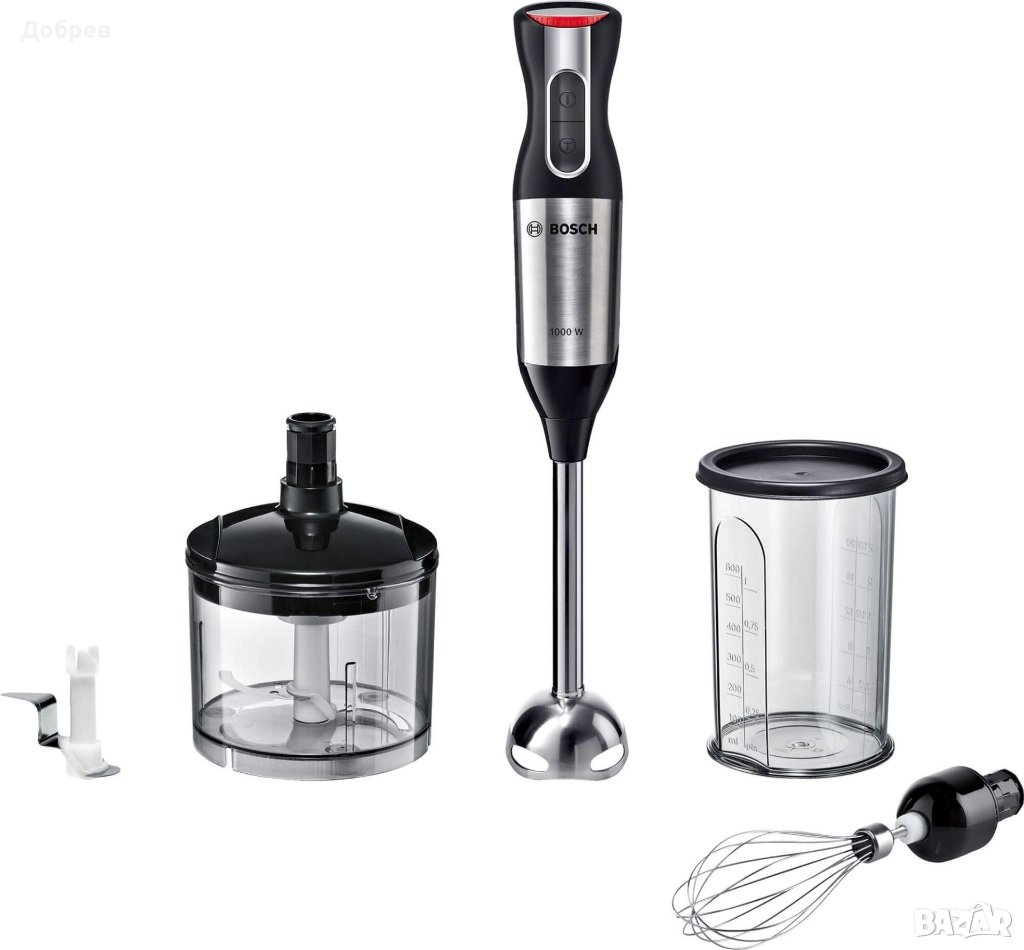 Пасатор BOSCH ErgoMixx Style 1000W MS64M6170 сет с чопър, бъркалки, купа и приставка за лед. Плавни обороти. Турбо бутон. Инокс. Нож с 4 остриета.