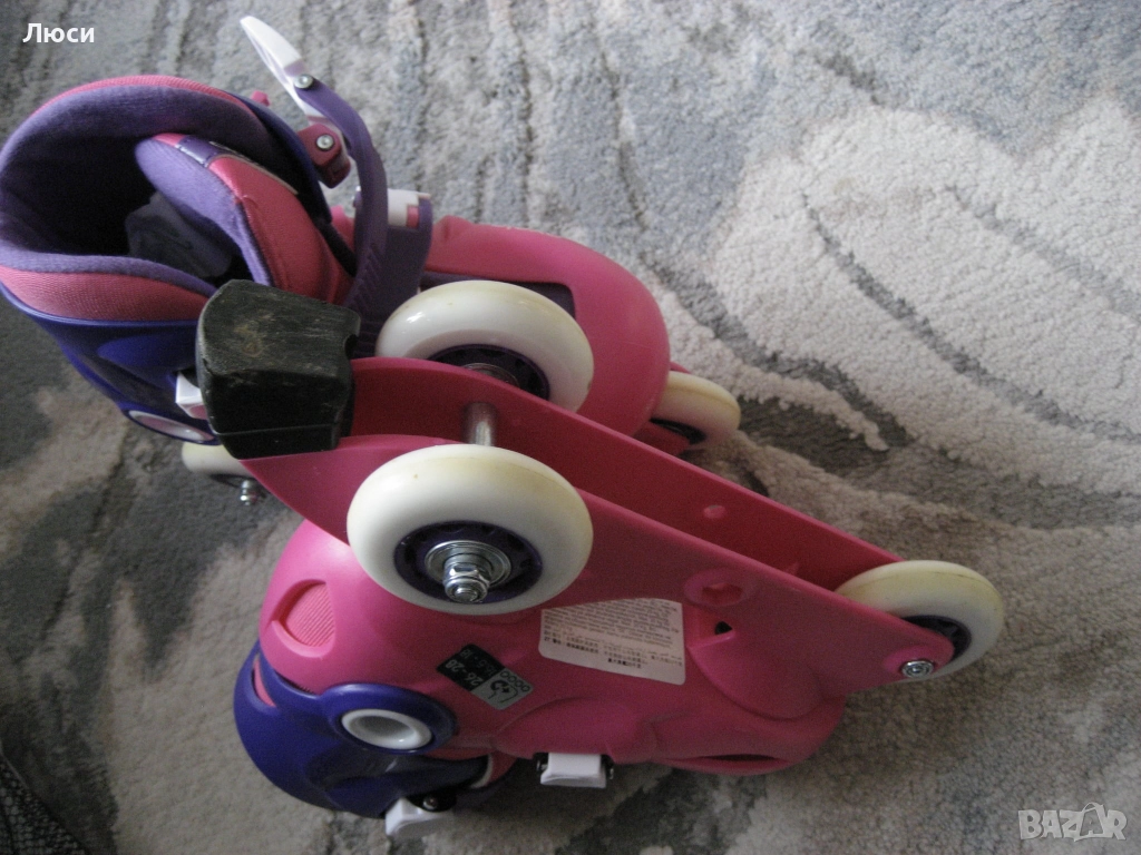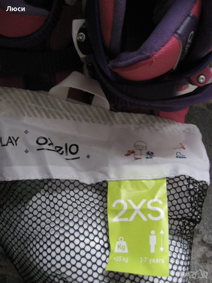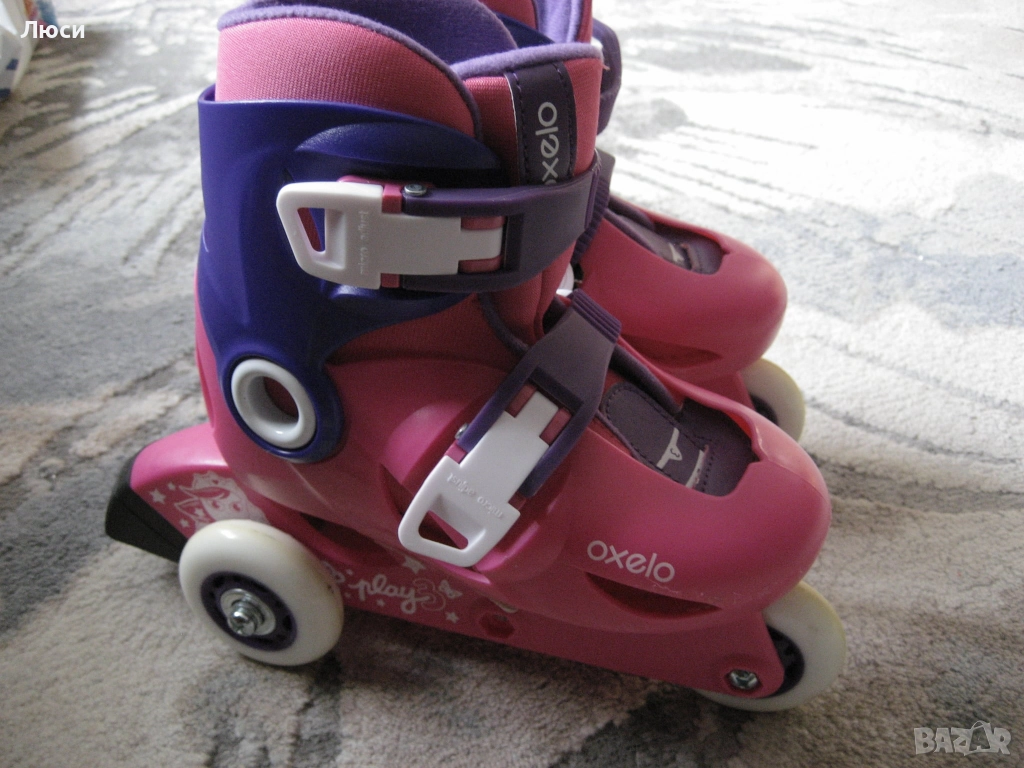 Само лично предаване . Детски регулируеми ролери ,,Oxelo,, БЕЗ ЗАБЕЛЕЖКИ ИЗПОЛЗВАНИ САМО 3 ПЪТИ- размер 26-28 (16,5 см -18см) + предпазни наколенки . Регулират се лесно и бързо. Имат вътрешен чорап регулируем в 3 размера с твърда черупка и 2 катарами за затягане . Подходящи за деца над 4 години ( до 20 кг) целия комплект е = 25 ев . На последни 4 снимки детска каска за колело , тротинетка , ХS/S (48-54см) от 3-7 г възраст . Без забележки , ползвана много малко = цена 7 ев .
