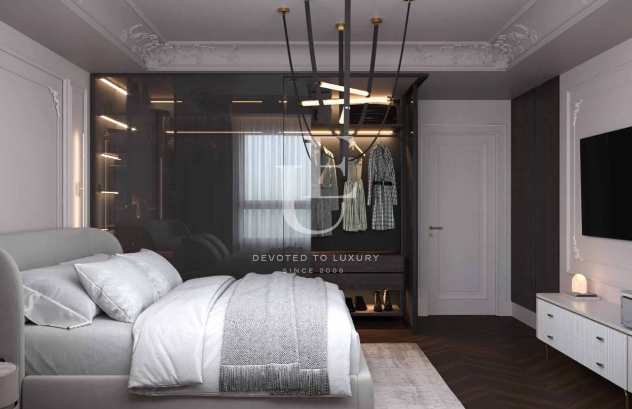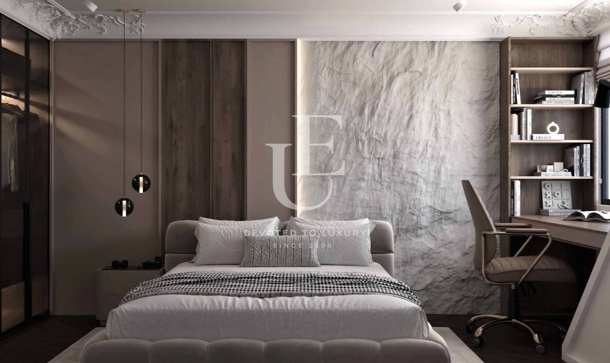 Жилището е оборудвано с модерно обзавеждане и висок клас уреди BOSCH, включително вградено осветление и кухненски остров с витрина за вино. Стилният интериор е реализиран с мебели по поръчка, създавайки изискан и готов за нанасяне дом.