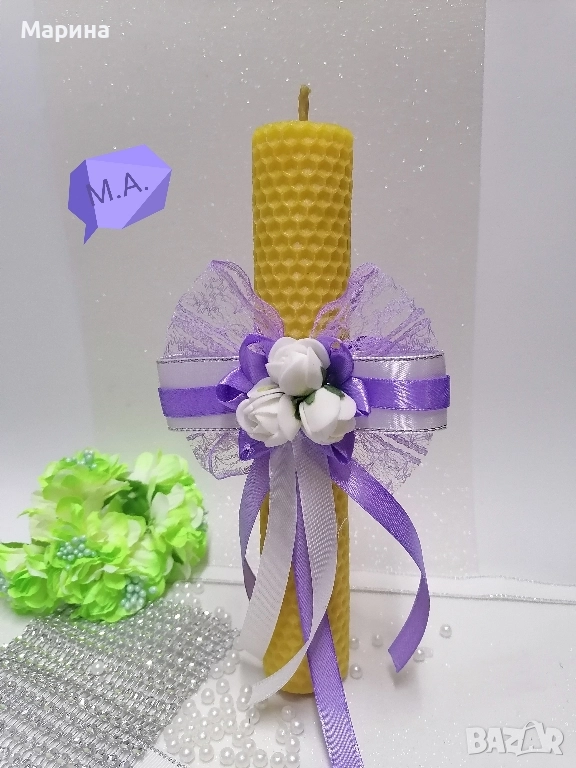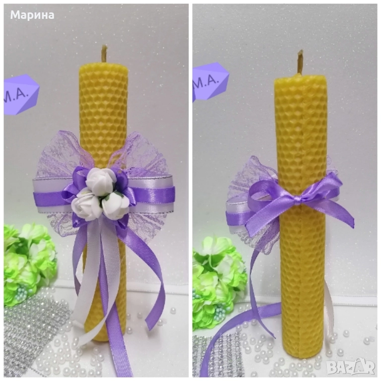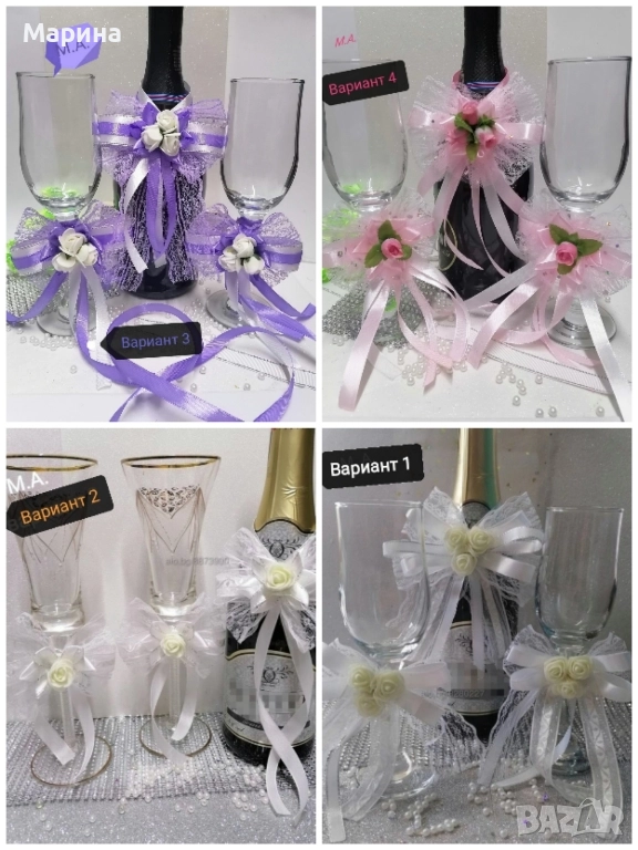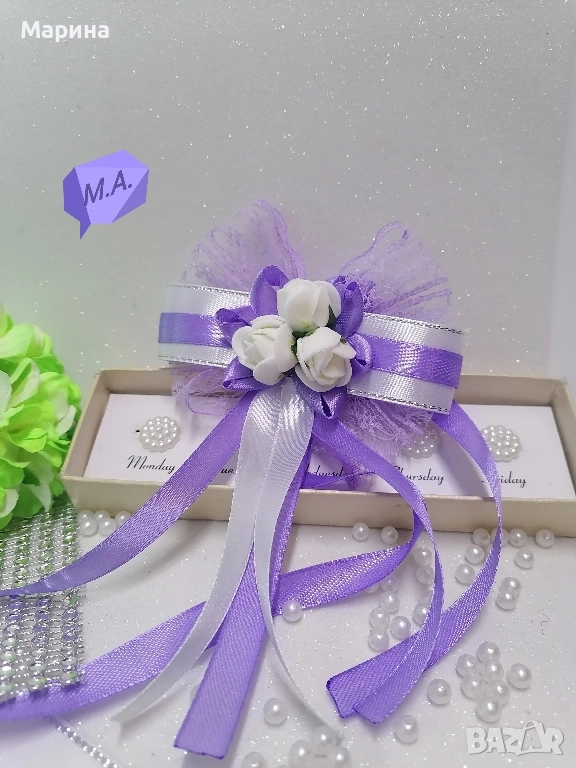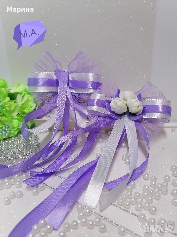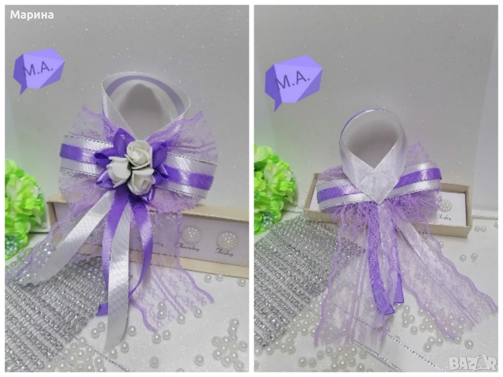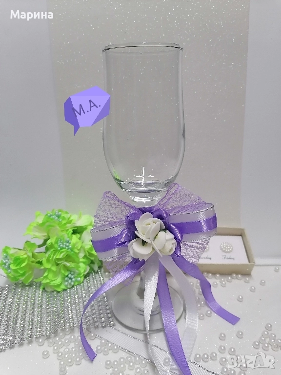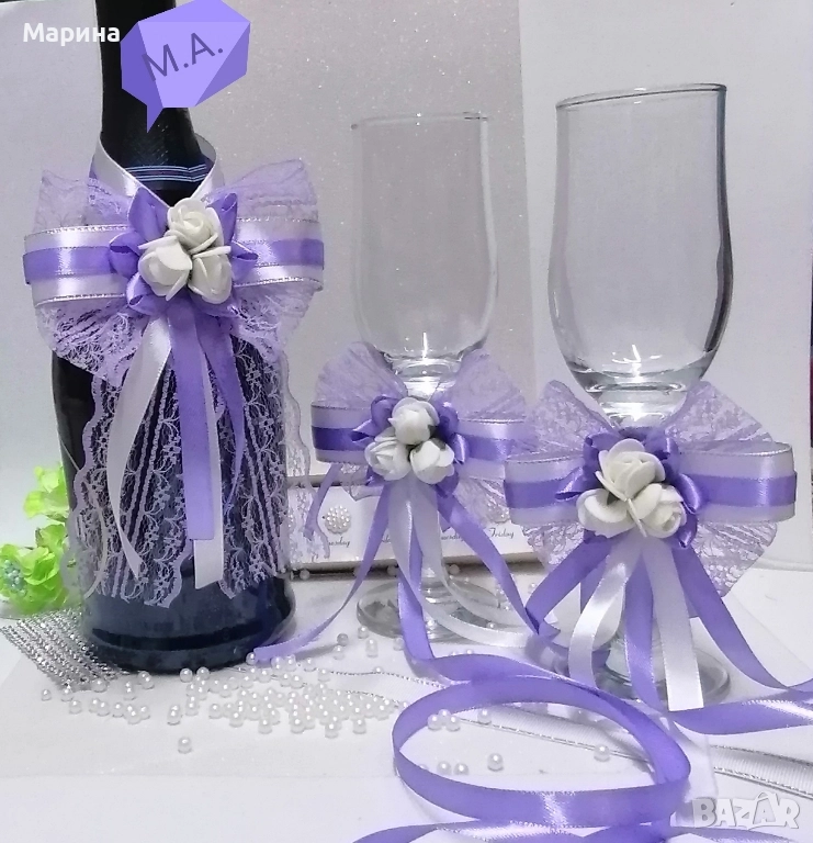Подвижна украса за сватбено шампанско и сватбени чаши, за свещи в лилаво. (Вариант 3). Ръчно изработено. Материал: сатен, дантела, рози бели. Ширина на панделка за чаша 10см. Ширина на панделка за шампанско 12см. Цена за комплект от 3 бр. е 13лв. Цена за 2бр. панделки за чаши или свещи е 9лв. Цена за 1бр. панделка е 4,50лв. Цена за панделка за шампанско е 6лв. Цената не включва комплекта чаши, шампанско и свещи от снимката. Изпращам на следващий ден със Спиди или Еконт.