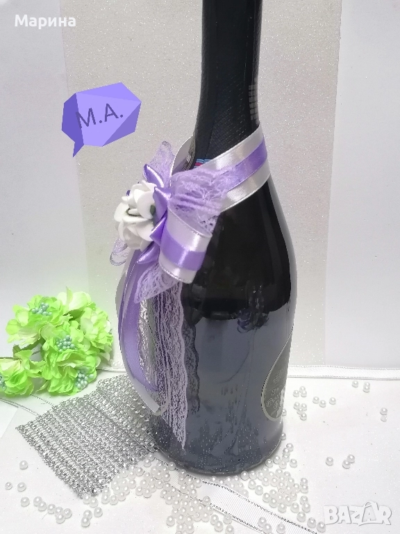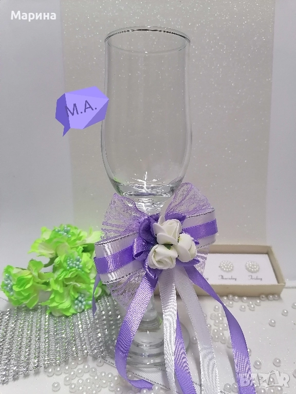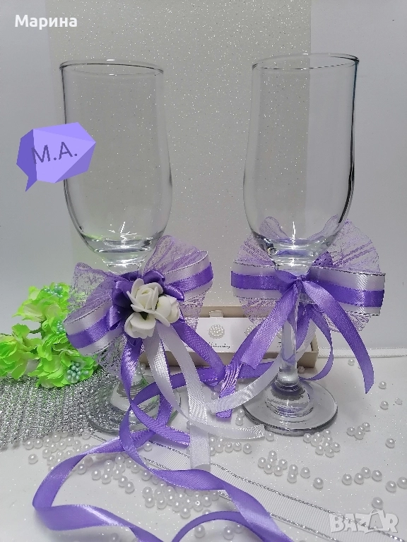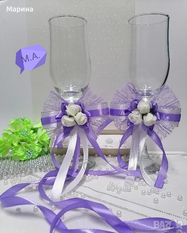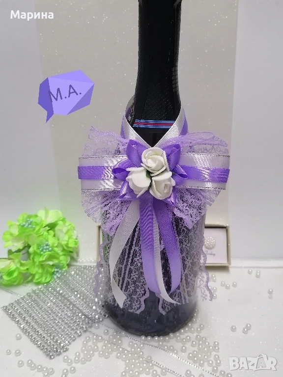 Подвижна украса за сватбено шампанско, за чаши, за свещи в лилаво. → Обява 52480938