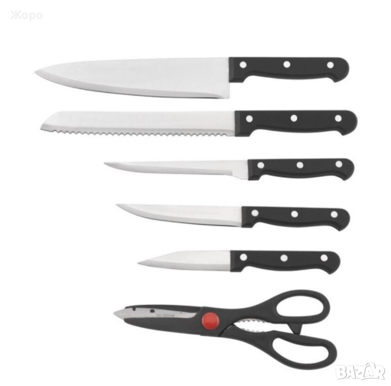Комплектът комбинира 7 ножа с полирани остриета, изработени от висококачествена неръждаема стомана и ножица