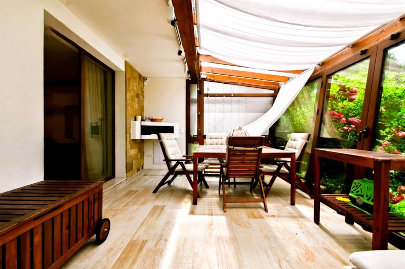 РАЗПРЕДЕЛЕНИЕ: Входно преддверие, просторна всекидневна с кухня и трапезария, четири спални, три санитарни помещения, мокро помещение и остъклена и отопляема зимна градина с изцяло южно изложение, с достъп от всяка стая.