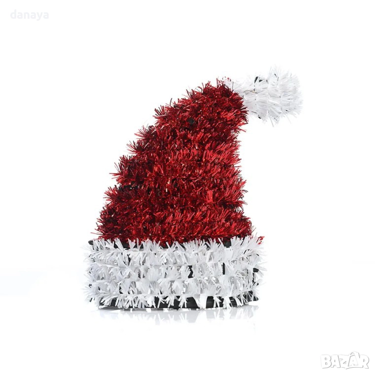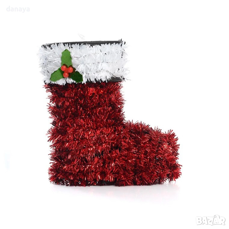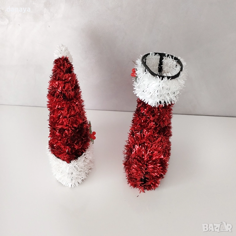 Коледна украса ботуш или коледна шапка. Тази празнична коледна фигура от блестящ гирлянд е създадена да бъде малкият акцент, който променя цялата атмосфера. Червеното и бялото създават класическо коледно настроение, а ефектният блясък веднага привлича погледа и внася усещане за топлина и уют в помещението.