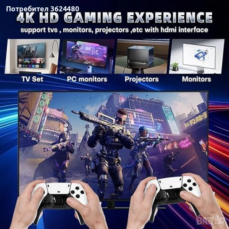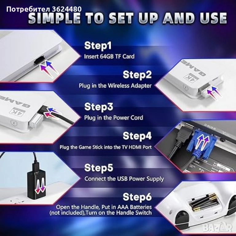 Лесен Монтаж: Просто включете Конзолата с HDMI 4K в телевизора с включения HDMI кабел за свързване към ТВ. Захранва се лесно чрез USB кабел за захранване на конзолата.