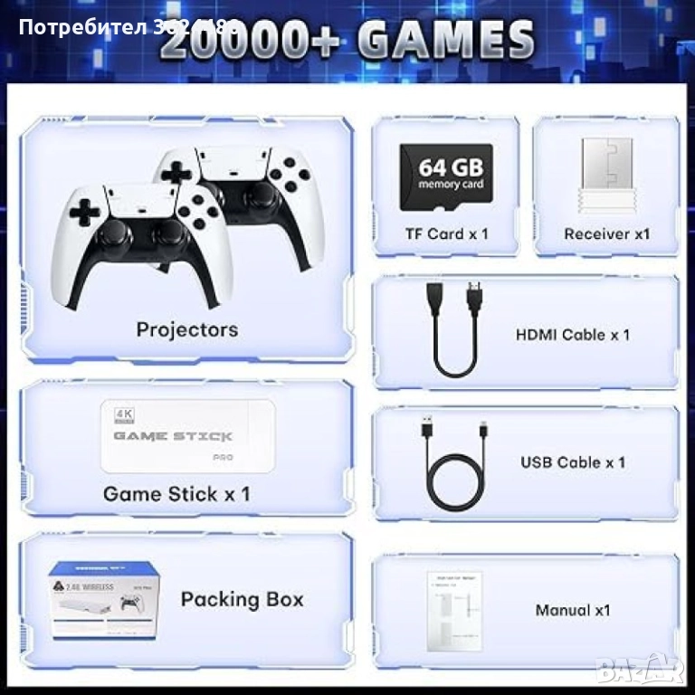Безжична Свобода: В комплекта са включени 2 броя безжични джойстици, осигуряващи комфорт при игра без кабели.