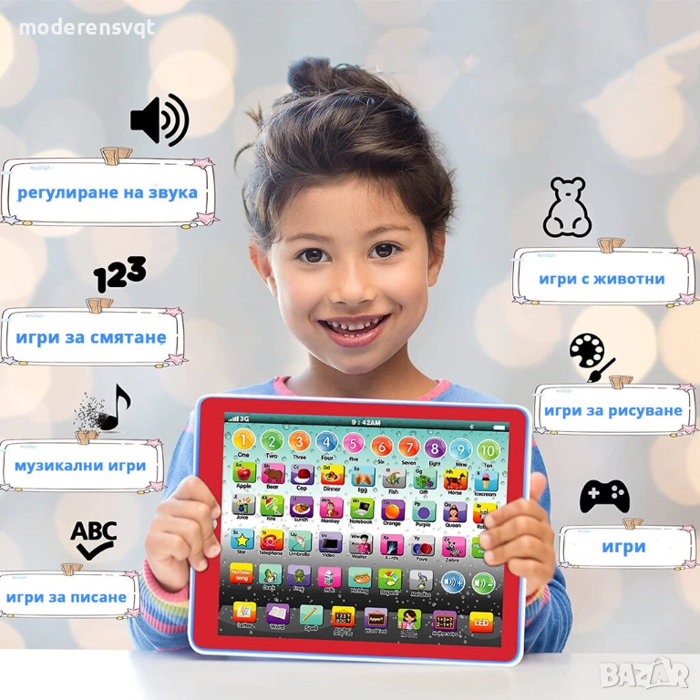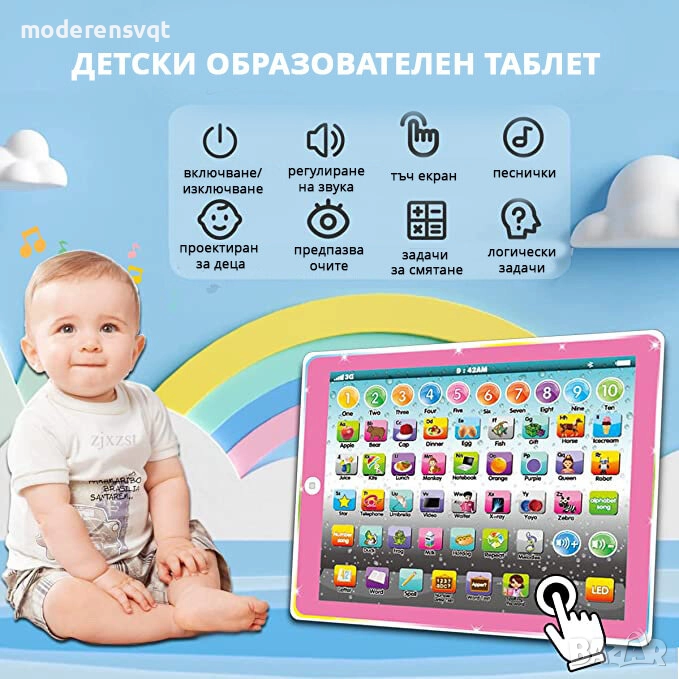 Обучаващият таблет на Български ще помогне на Вашето дете да се научи да разпознава и изговаря правилно буквите от българската азбука. Детската играчка ще обучава и изпитва детето Ви изцяло на Български език и ще му помогне да мисли логически. Освен откриването на думи, букви и цифри, образователния таблет предоставя и възможност за пресмятане и събиране, което допълнително ще развие способностите на малчугана.