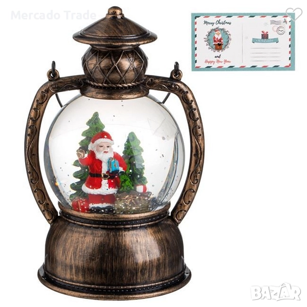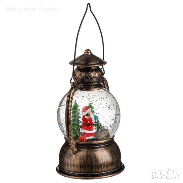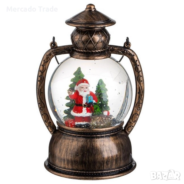 Коледен снежен фенер в бронзов цвят с фигурка на Дядо Коледа и холографски брокат вътре, LED осветление и музика. Има тестов бутон на основата, който активира брокатите, музиката и светлините.