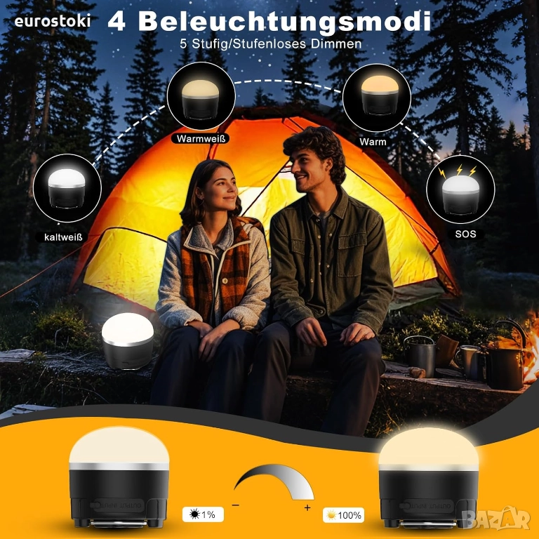 Къмпинг светлините за открито са с двоен дизайн от куки и мощни магнити, които могат не само да се окачват на клони или палатки, но и да се прикрепят към метални повърхности за лесна проверка на оборудването или ремонт на машини. Светлините за къмпинг палатки са водоустойчиви по IPX5 и могат да се използват както на закрито, така и на открито.