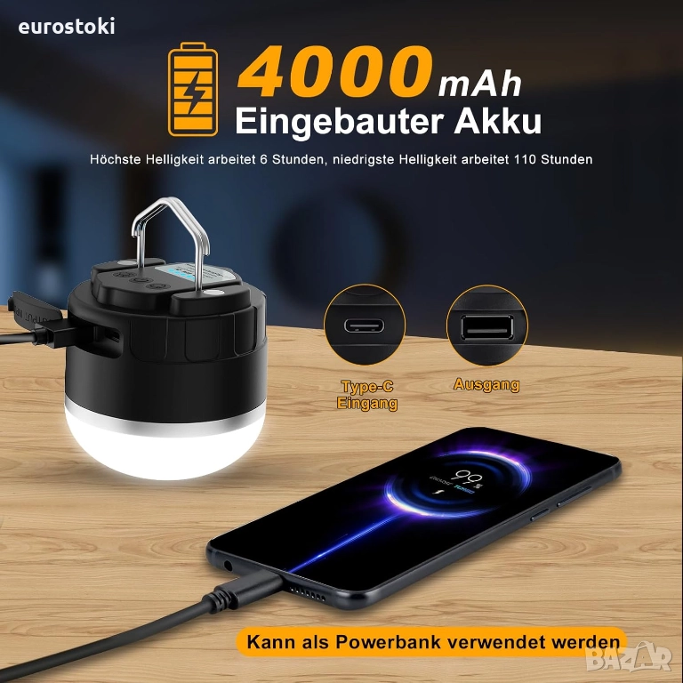 LED къмпинг лампа с акумулаторна батерия - преносима външна лампа за палатка с батерия 4000mAh