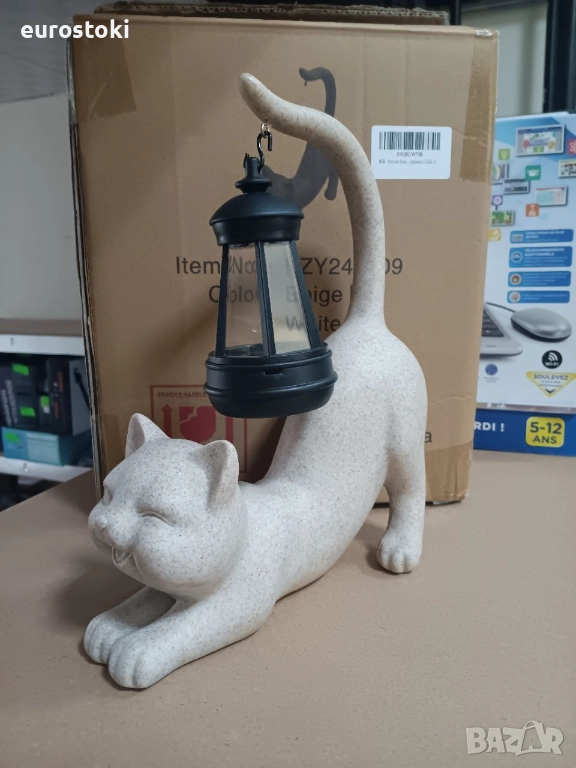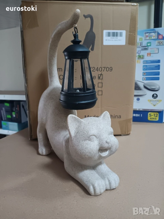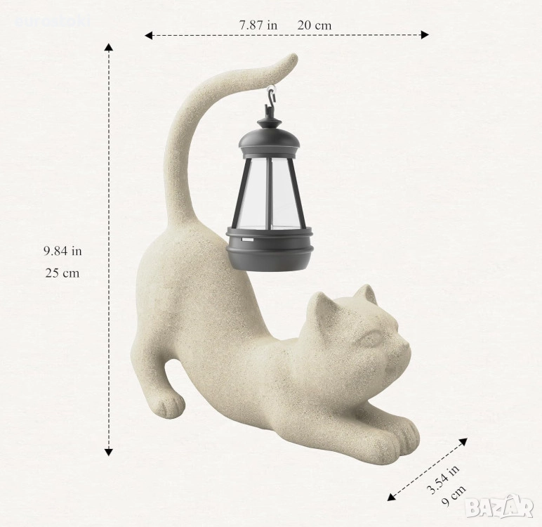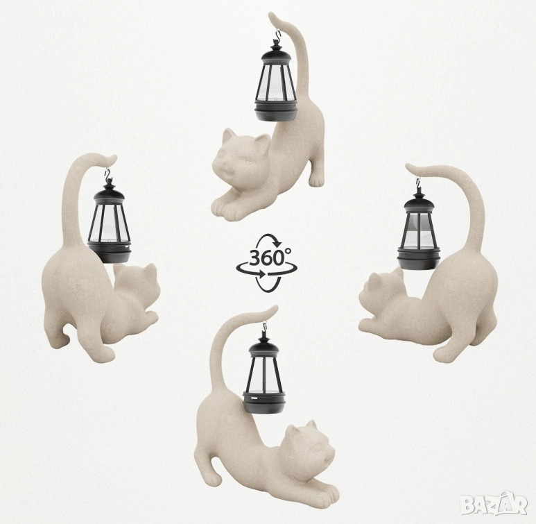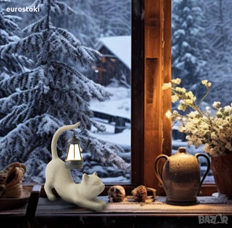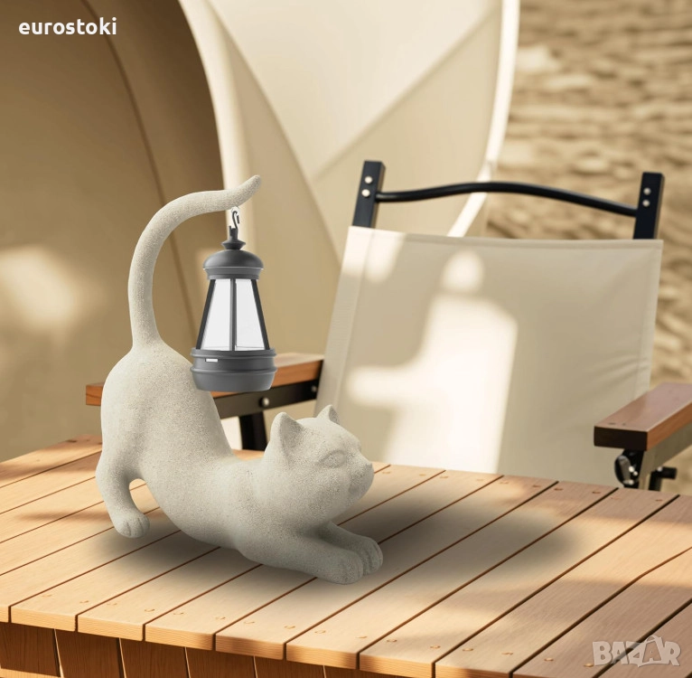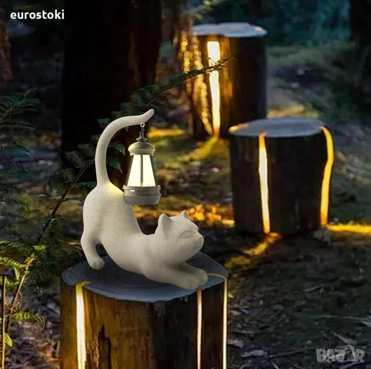 Статуетката на котката включва подвижен соларен фенер, който хвърля магическо сияние в тъмното.