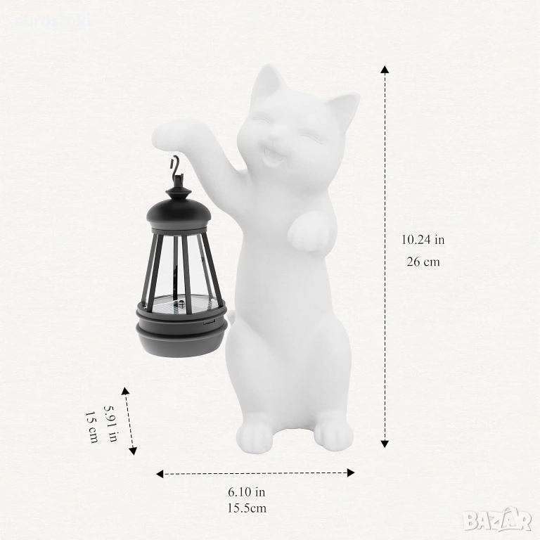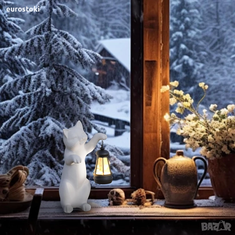Статуя на котка от смола със соларен фенер - външни и вътрешни декорации, статуи с фенери за градина, двор, веранда, дом, балкон. Подаръци. Бяла