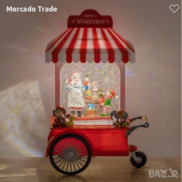 Коледен музикална фигурка с във формата на магазин за бонбони с фигурки на Дядо Коледа, елф и малко дете с холографски брокат вътре, LED осветление и музика. Има тестов бутон на основата, който активира брокатите, музиката и светлините.