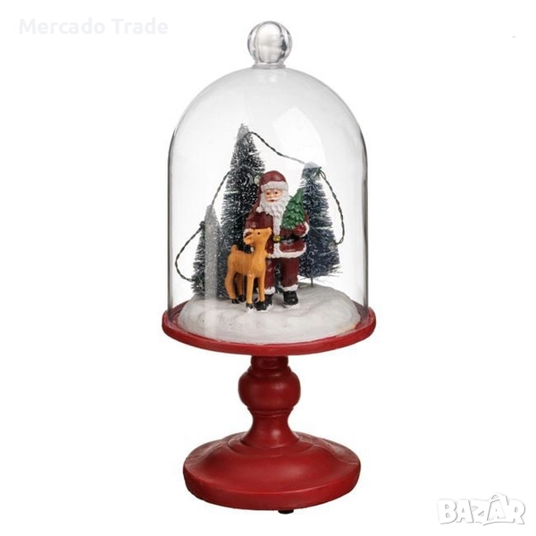 Коледен декоративен червен купол за маса със сняг, фигурка на Дядо Коледа с елени и елхи. Елхите имат LED осветление.