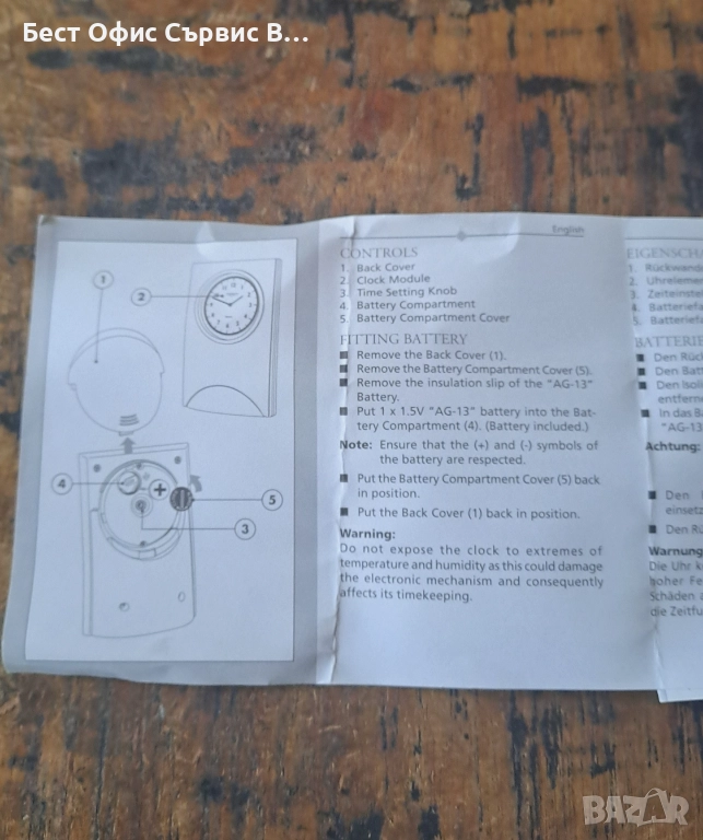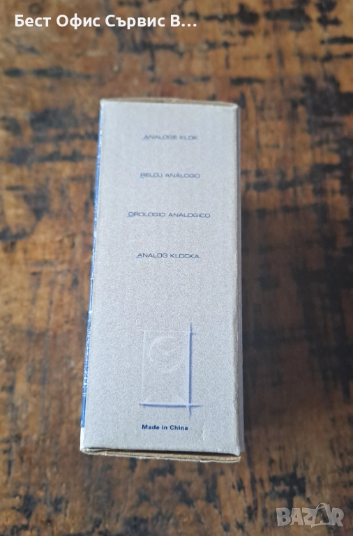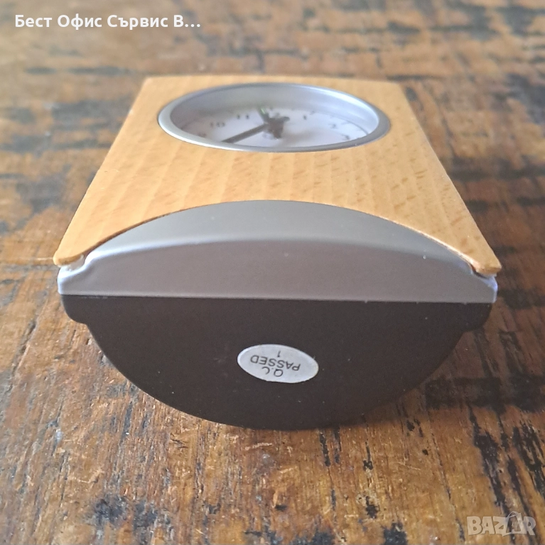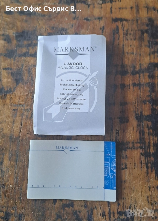 Продавам часовник Марксман Marksman за бюро аналогов кварцов quartz дървен отпред . Внос от Холандия. Пластмасов с дървена предна част. Работи с 1 батерия AG13 1.5 V (не е включена). Има инструкция за употреба и сертификат. Размер на часовника: 10.4x6.7x4 см, размер на циферблата 4.8 см. PF продукт, Art. no. 542.741. Уникален. Много рядък. От частна колекция. Чудесен подарък. За ценители. Имам 2 броя.